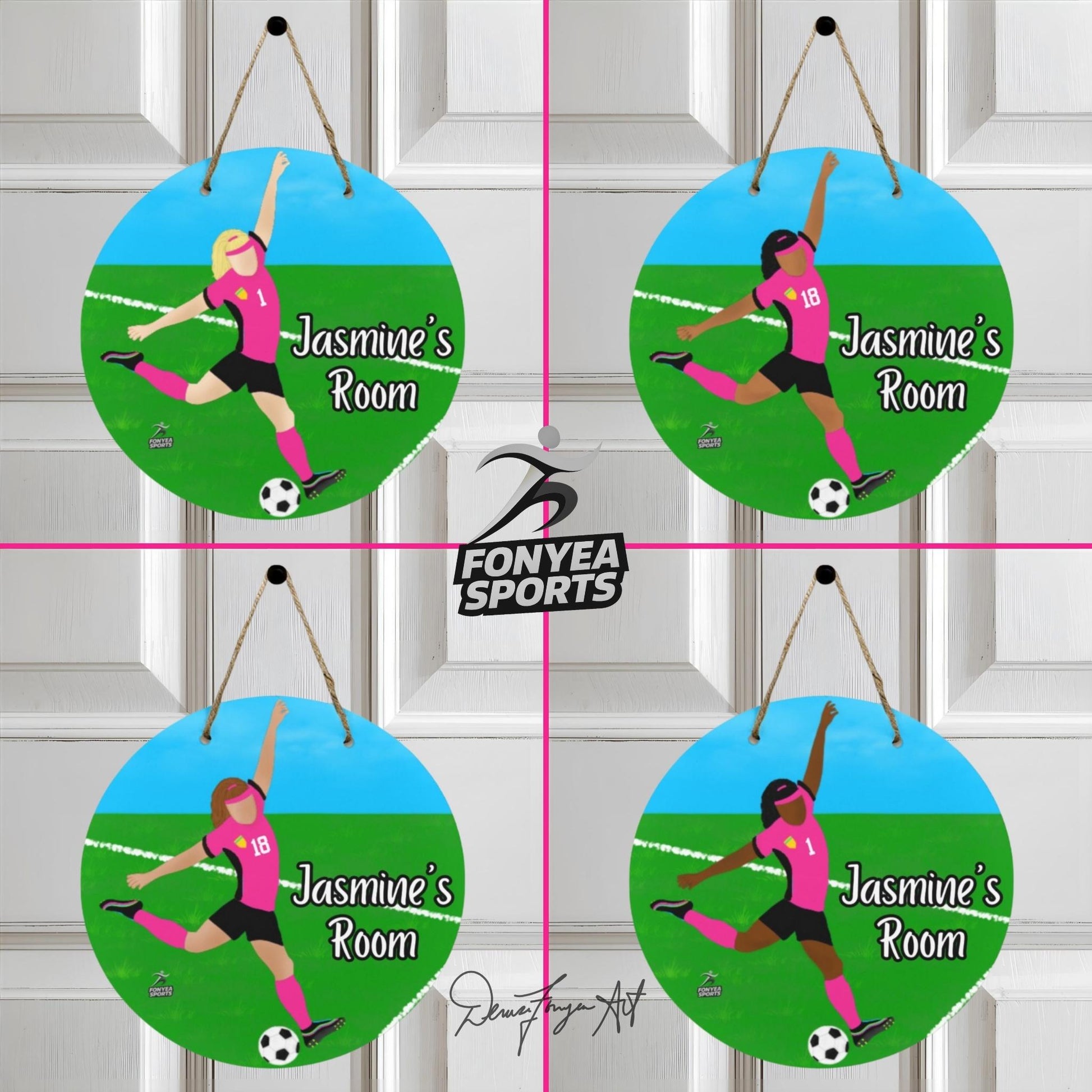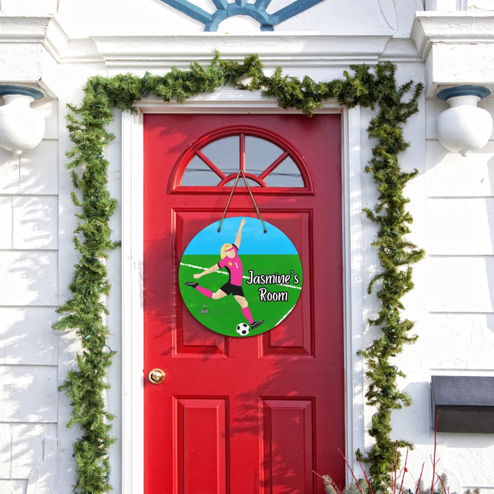 Fonyea Sports Soccer Girl Round Wooden Door Sign 11.8''